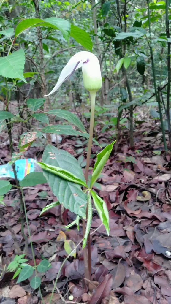Common name White hood cobra lily, in marathi Pandhra sap kanda. Just after the first showers in June, this tuberous herb sprouts all over Matheran.