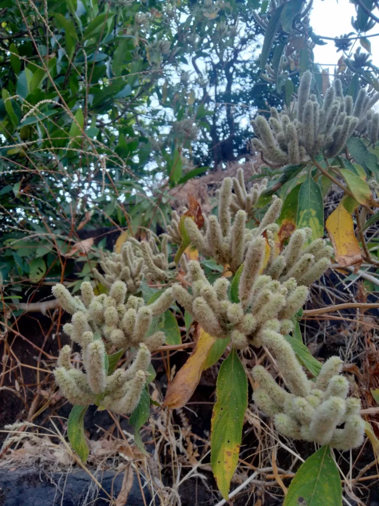 Common name is Indian Squirrel Tail, in Marathi Bhaman. It is a branched shrub growing between 1-3 m tall. Leaves are opposite, lanceolate, slight serrated, 10-15 cm long. The leaves are dark green above and whitish hairy below. Numerous tiny white flowers appear in panicles of upright spikes, 5-10 cm long. The flower spikes look hairy and resemble a squirrel’s tail. Flowers between December to April.