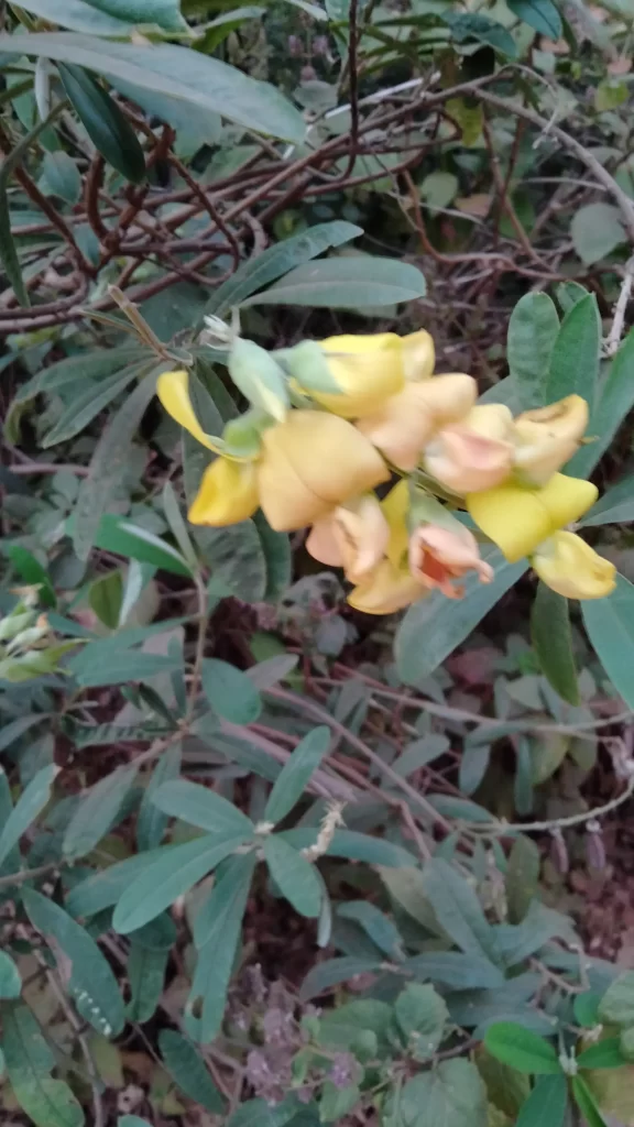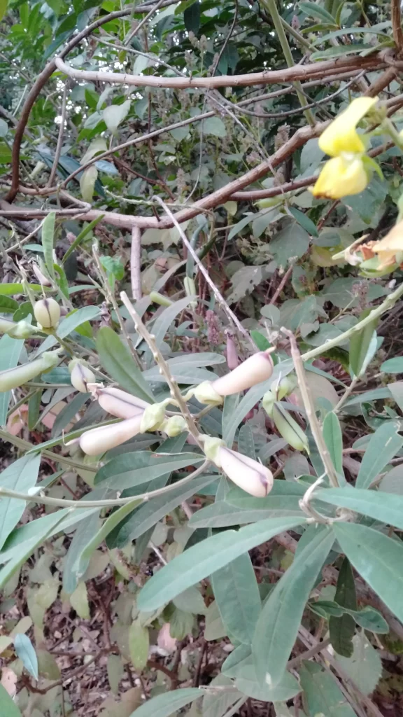 Common name is Rattleweed, because when it’s fruit is shaken it makes a sound like a rattle. It is an annual herb. Leaves are simple, inverted and lance shaped. The petals of the flower are yellow with fine purple lines near the base. Pods are greenish to start with and turns brown to black at maturity.